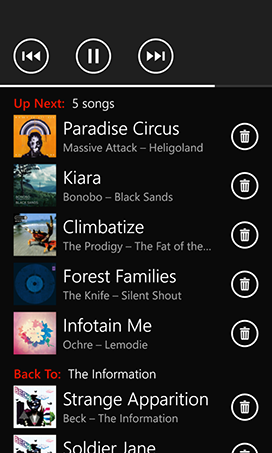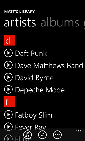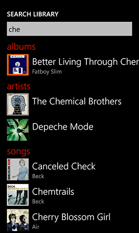 Remote allows you to see all the artists, albums, songs, and playlists in your library. You can even use your device's keyboard to search for albums, artists, and songs by name. Once you find the media you're looking for, just tap to start playback.