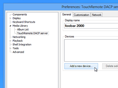 On the left side of the Preferences window, select Media Library → TouchRemote DACP Server. Click the button that says Add a new device to continue.