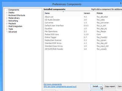 After downloading foo_touchremote, select Library → Configure from the menu bar and select Components from the left side of the Preferences window. Click the Install button and locate the foo_touchremote zip file.